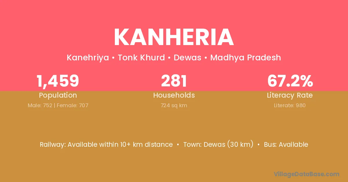 Dewas (30 km) is the nearest town to Kanheria village for major economic activities and is located approximately 30 km away.