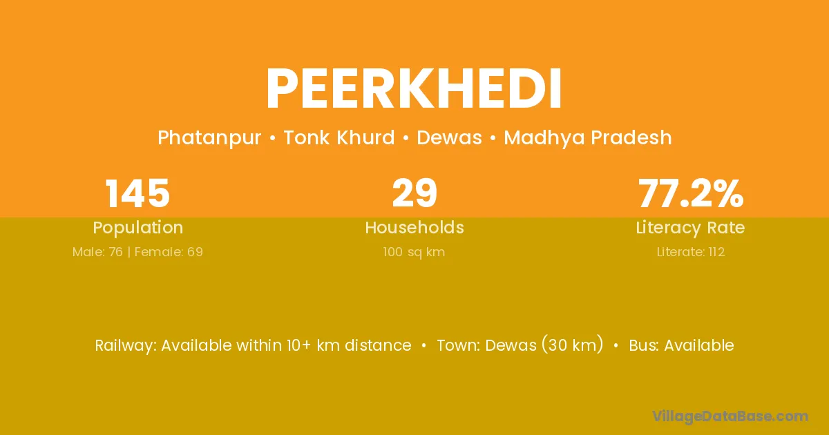 Dewas (30 km) is the nearest town to Peerkhedi village for major economic activities and is located approximately 30 km away.