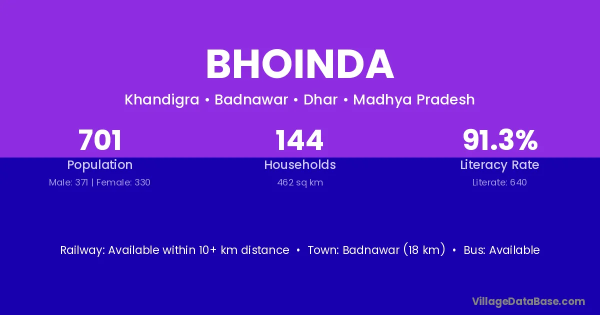 Badnawar (18 km) is the nearest town to Bhoinda village for major economic activities and is located approximately 18 km away.