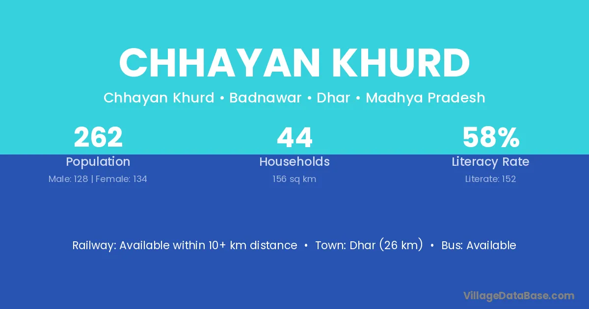 Dhar (26 km) is the nearest town to Chhayan Khurd village for major economic activities and is located approximately 26 km away.