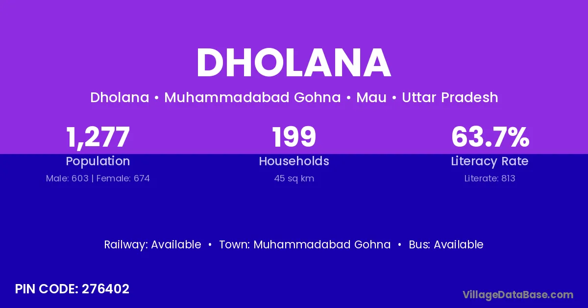 The literacy rate of Dholana village is 64.12%. Male literacy stands at 76.28% and female literacy at 51.30%.