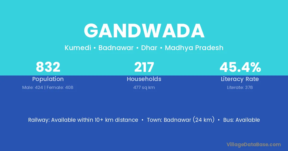 Badnawar (24 km) is the nearest town to Gandwada village for major economic activities and is located approximately 24 km away.