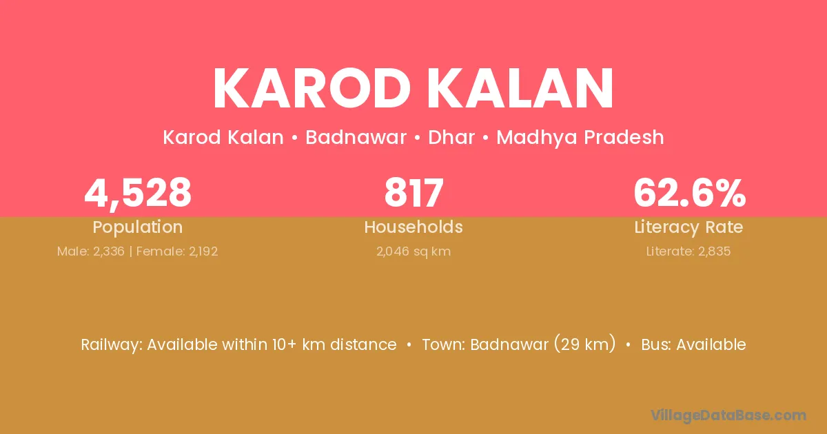Badnawar (29 km) is the nearest town to Karod Kalan village for major economic activities and is located approximately 29 km away.