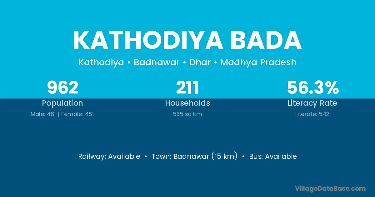 Badnawar (15 km) is the nearest town to Kathodiya Bada village for major economic activities and is located approximately 15 km away.