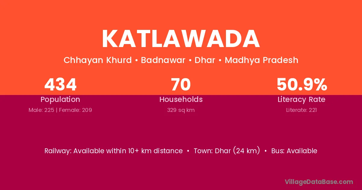 Dhar (24 km) is the nearest town to Katlawada village for major economic activities and is located approximately 24 km away.