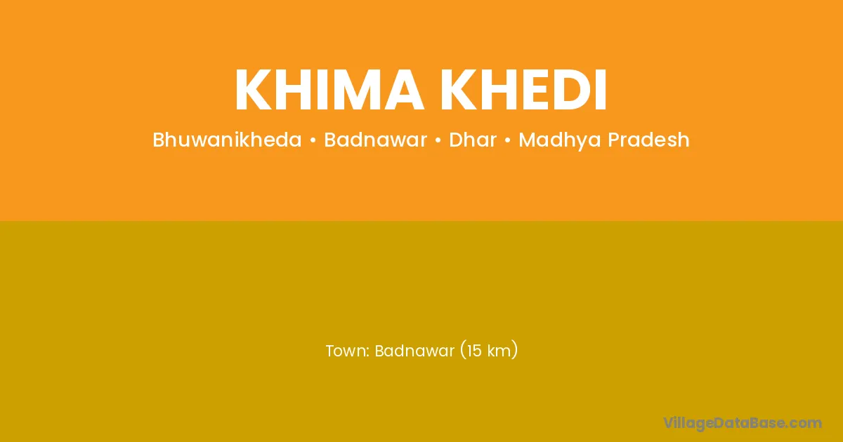 Badnawar (15 km) is the nearest town to Khima Khedi village for major economic activities and is located approximately 15 km away.
