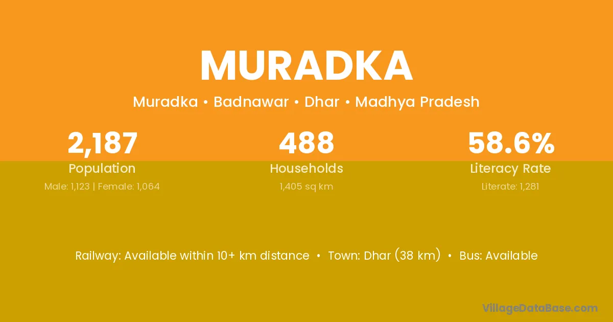 Dhar (38 km) is the nearest town to Muradka village for major economic activities and is located approximately 38 km away.
