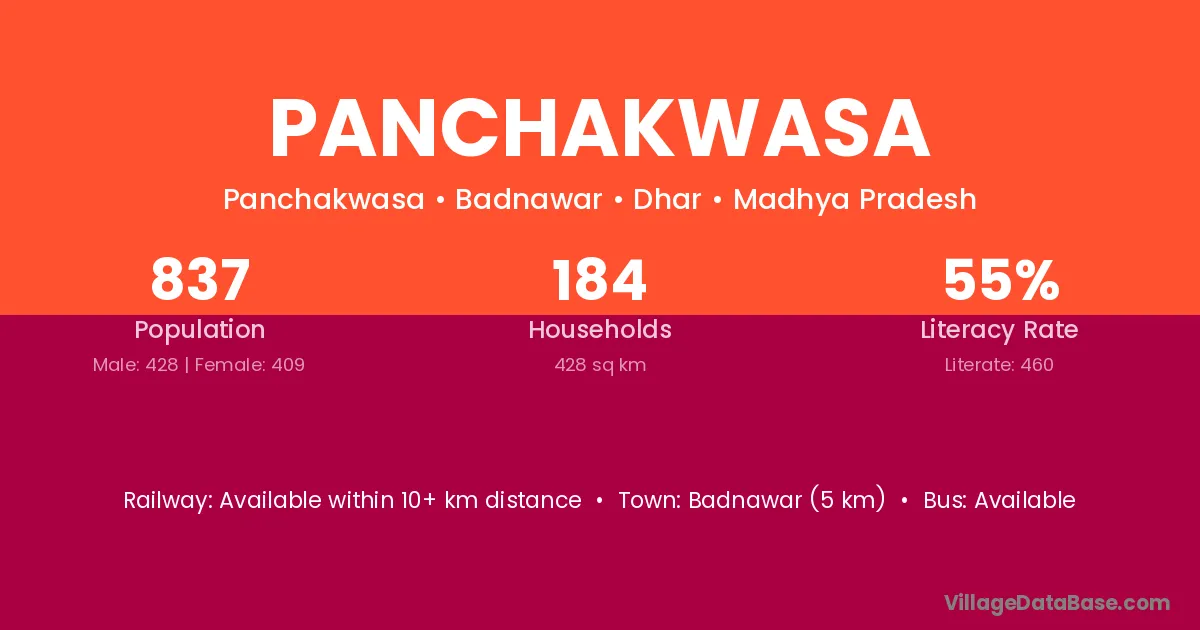 Badnawar (5 km) is the nearest town to Panchakwasa village for major economic activities and is located approximately 5 km away.