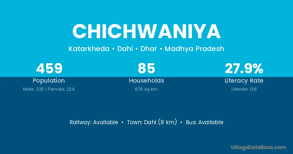 Chichwaniya village has a total population of 459 people, of which 235 are males and 224 are females.