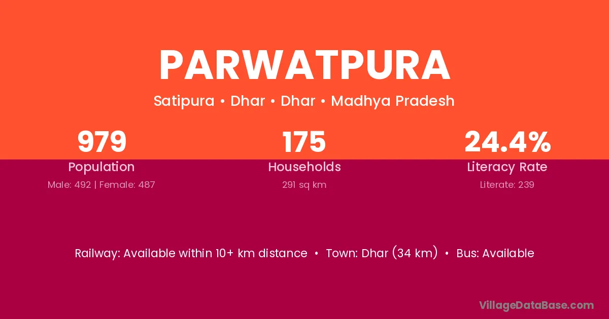 Dhar (34 km) is the nearest town to Parwatpura village for major economic activities and is located approximately 34 km away.