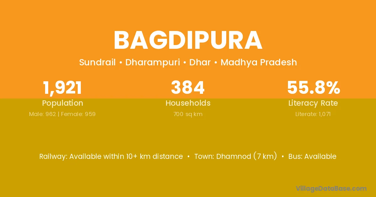 Dhamnod (7 km) is the nearest town to Bagdipura village for major economic activities and is located approximately 7 km away.