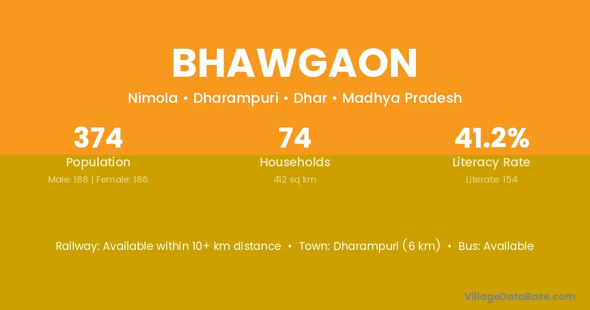 Dharampuri (6 km) is the nearest town to Bhawgaon village for major economic activities and is located approximately 6 km away.