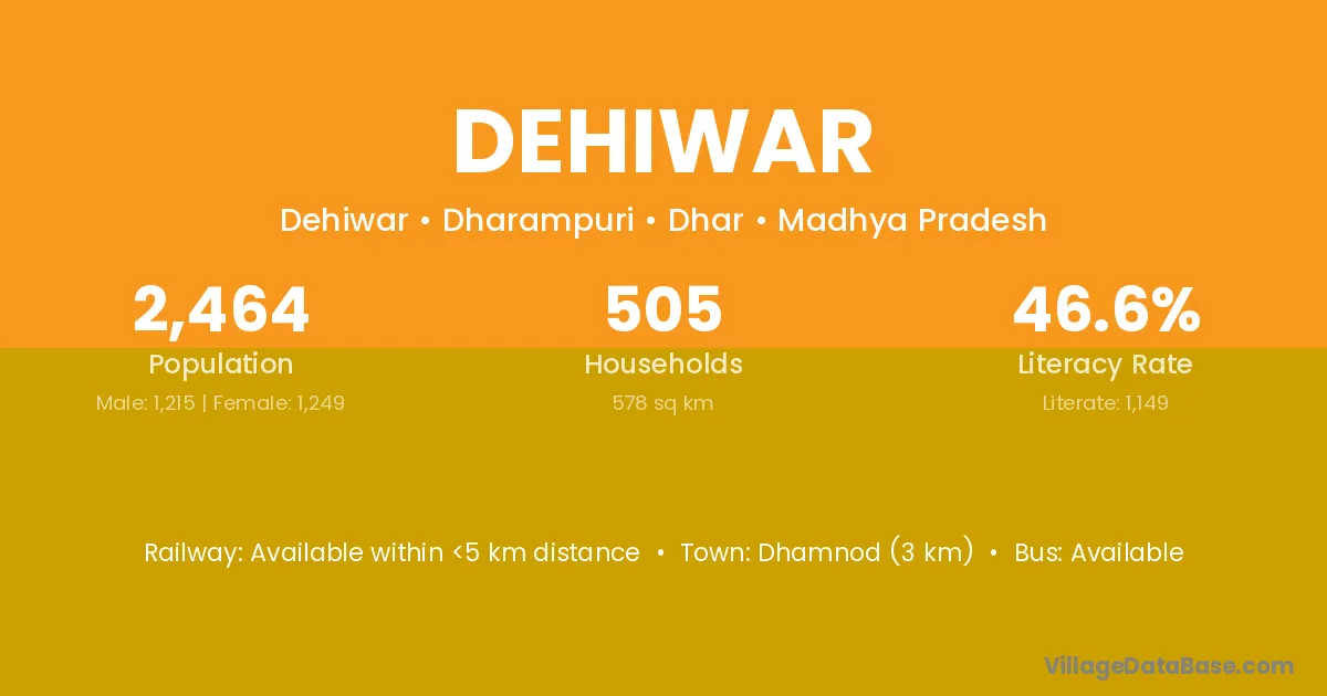 Dhamnod (3 km) is the nearest town to Dehiwar village for major economic activities and is located approximately 3 km away.