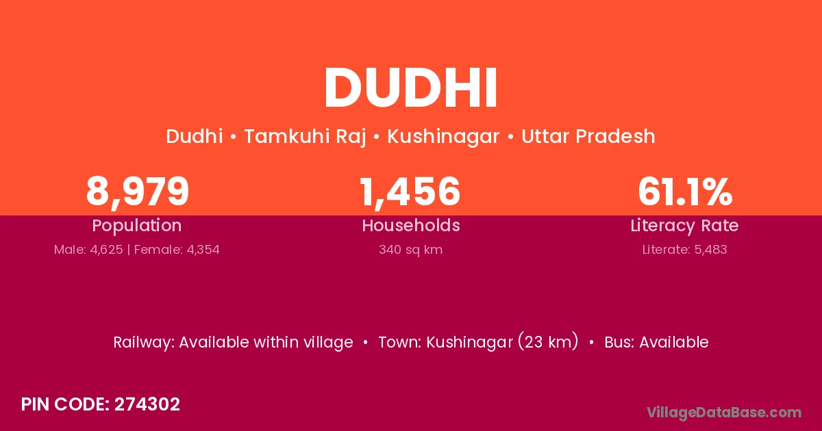 The literacy rate of Dudhi village is 50.32%. Male literacy stands at 58.43% and female literacy at 41.82%.