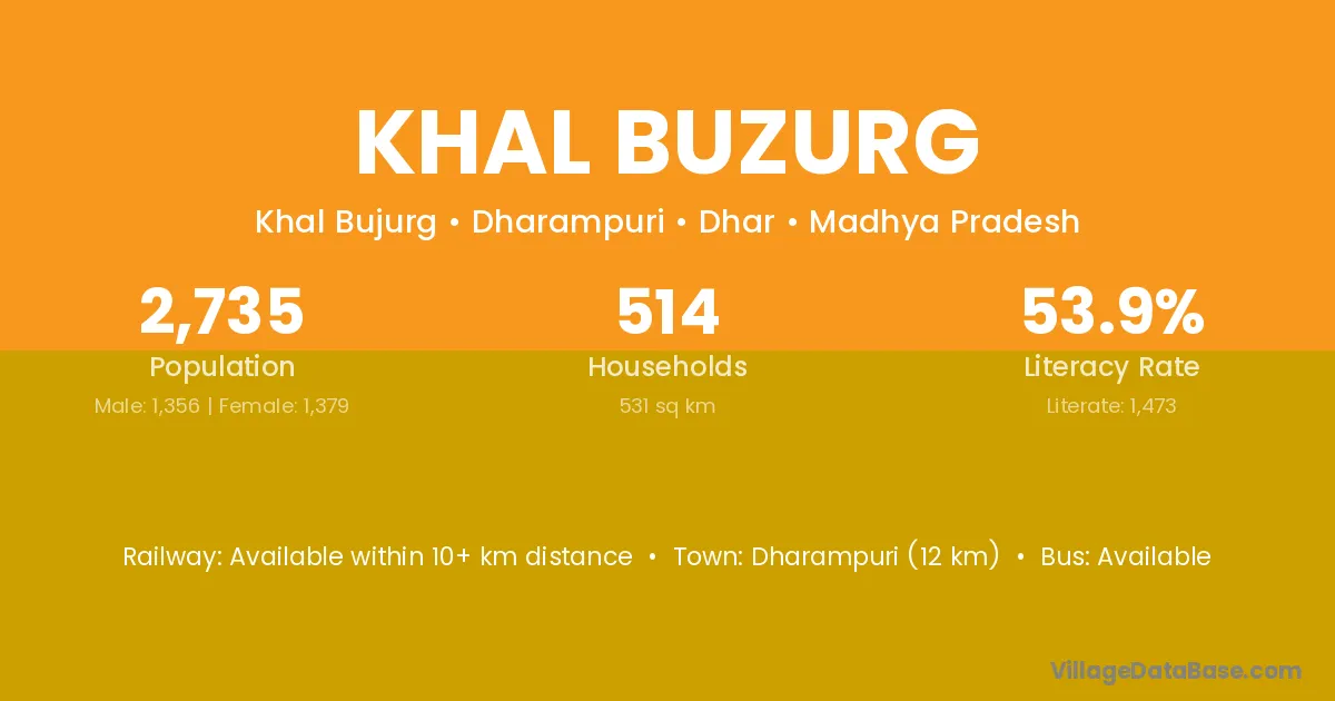 Dharampuri (12 km) is the nearest town to Khal Buzurg village for major economic activities and is located approximately 12 km away.