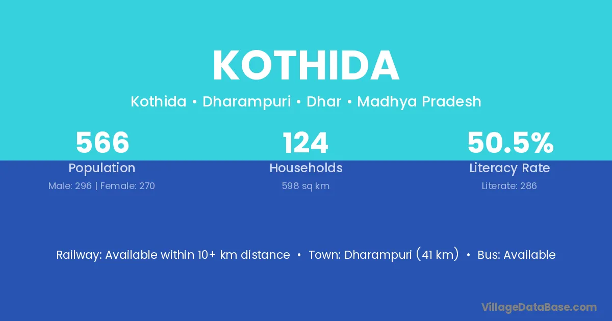 Dharampuri (41 km) is the nearest town to Kothida village for major economic activities and is located approximately 41 km away.