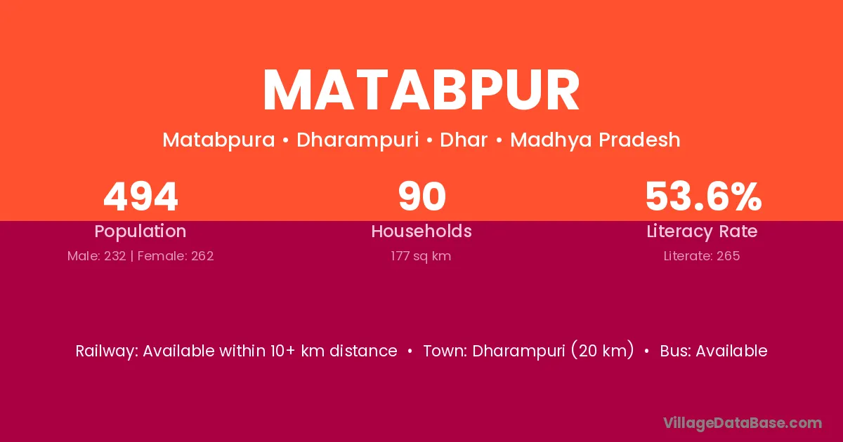 Dharampuri (20 km) is the nearest town to Matabpur village for major economic activities and is located approximately 20 km away.