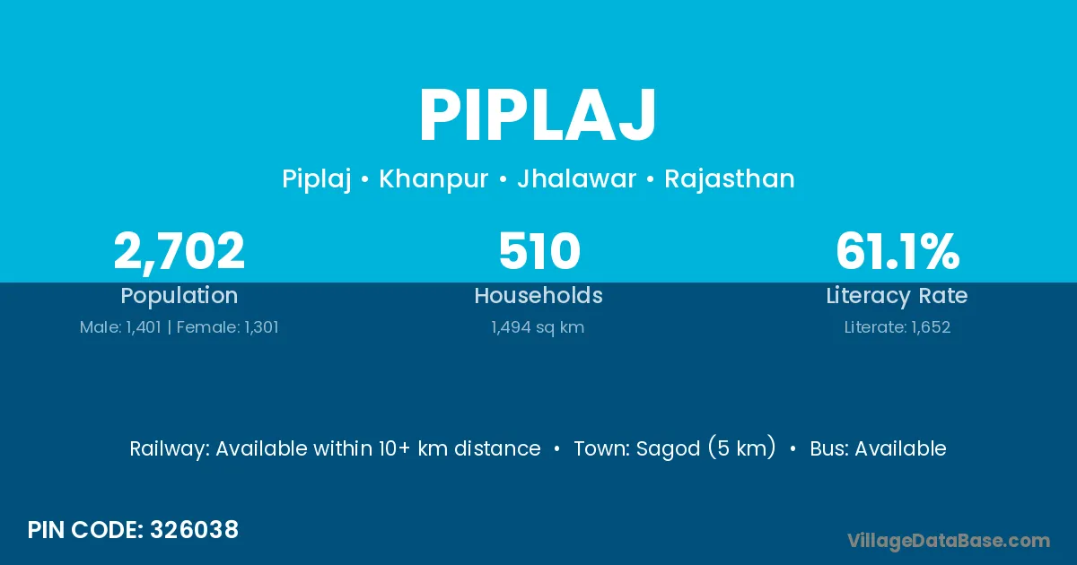 Dhamnod (22 km) is the nearest town to Piplaj village for major economic activities and is located approximately 22 km away.