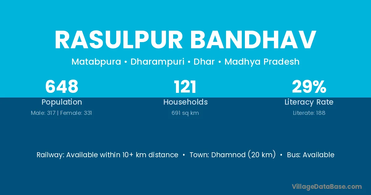 Dhamnod (20 km) is the nearest town to Rasulpur Bandhav village for major economic activities and is located approximately 20 km away.