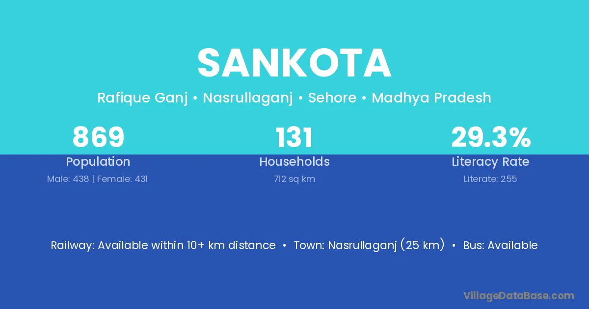 Dhamnod (9 km) is the nearest town to Sankota village for major economic activities and is located approximately 9 km away.