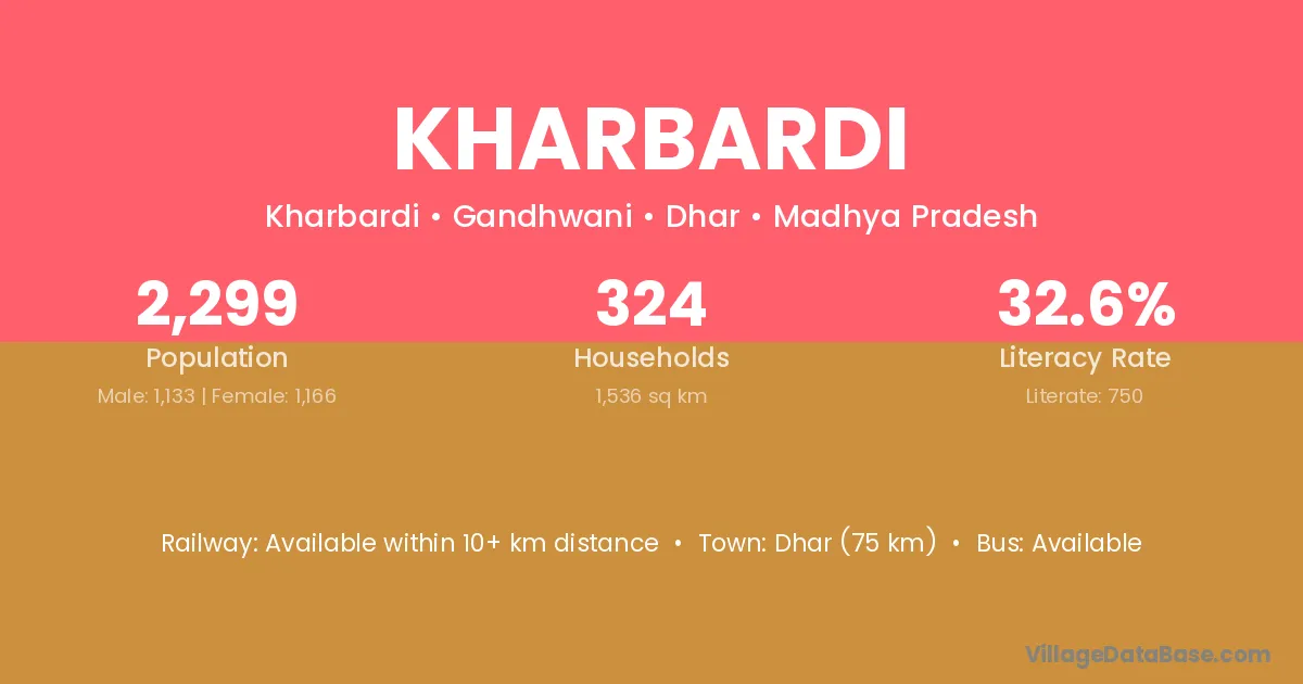 Dhar (75 km) is the nearest town to Kharbardi village for major economic activities and is located approximately 75 km away.