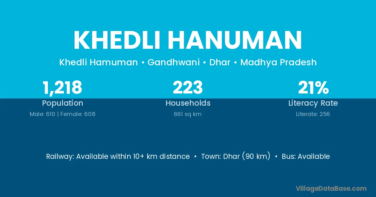 Dhar (90 km) is the nearest town to Khedli Hanuman village for major economic activities and is located approximately 90 km away.