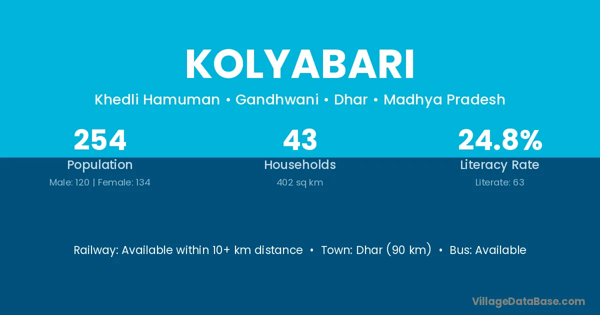 Dhar (90 km) is the nearest town to Kolyabari village for major economic activities and is located approximately 90 km away.