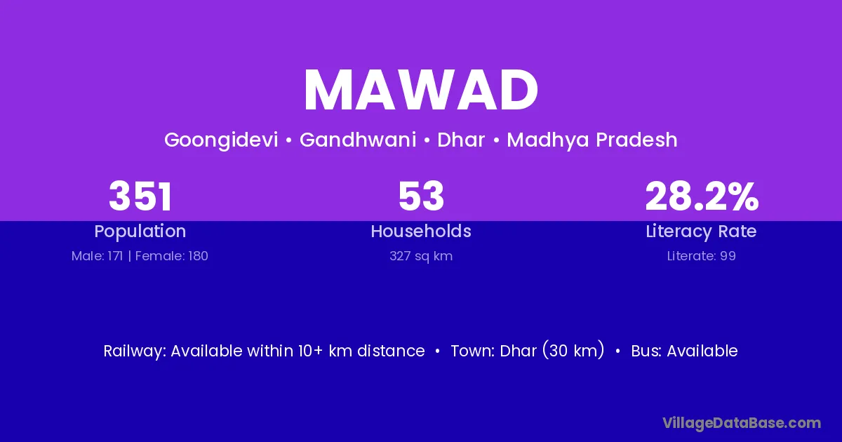 Dhar (30 km) is the nearest town to Mawad village for major economic activities and is located approximately 30 km away.