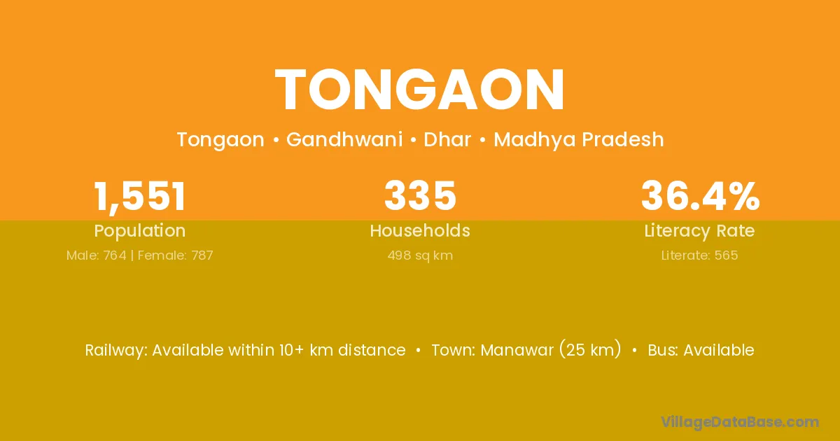 Manawar (25 km) is the nearest town to Tongaon village for major economic activities and is located approximately 25 km away.