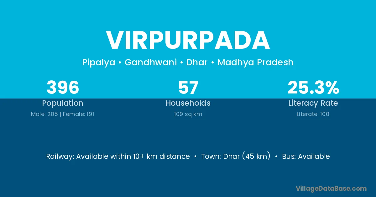 Dhar (45 km) is the nearest town to Virpurpada village for major economic activities and is located approximately 45 km away.