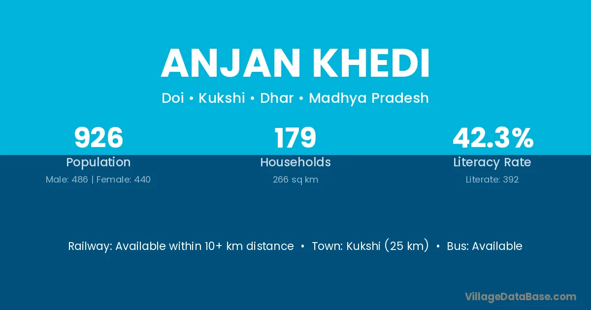 Kukshi (25 km) is the nearest town to Anjan Khedi village for major economic activities and is located approximately 25 km away.