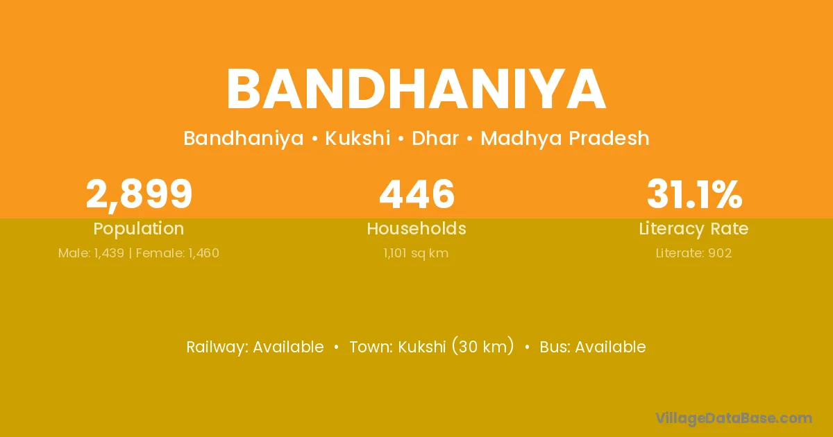 Kukshi (30 km) is the nearest town to Bandhaniya village for major economic activities and is located approximately 30 km away.