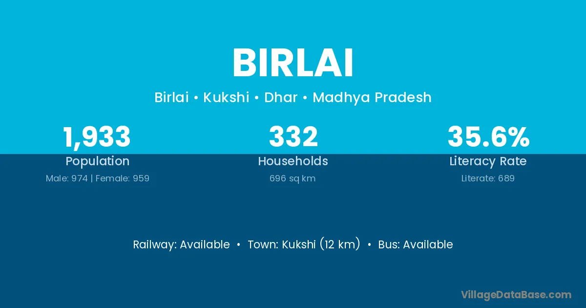 Kukshi (12 km) is the nearest town to Birlai village for major economic activities and is located approximately 12 km away.