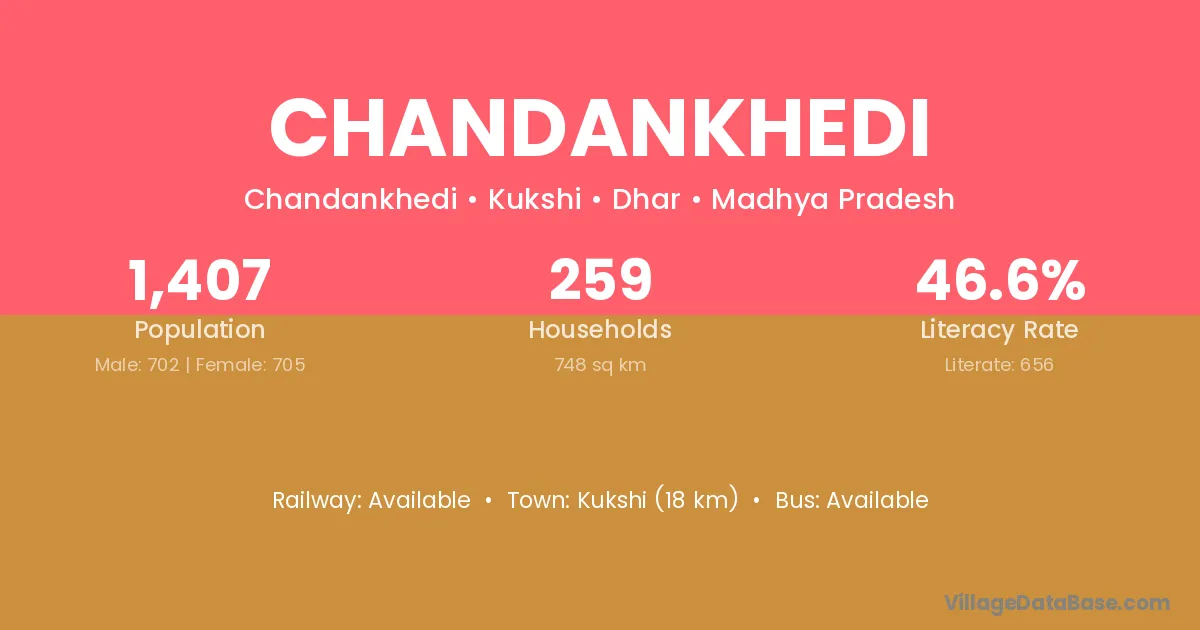 Chandankhedi village has a total population of 1,407 people, of which 702 are males and 705 are females.
