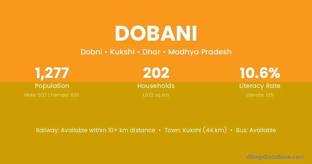 Kukshi (44 km) is the nearest town to Dobani village for major economic activities and is located approximately 44 km away.