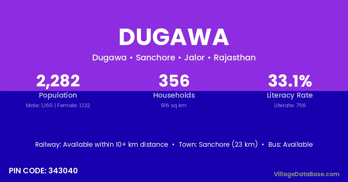 The literacy rate of Dugawa village is 50.66%. Male literacy stands at 60.77% and female literacy at 40.71%.