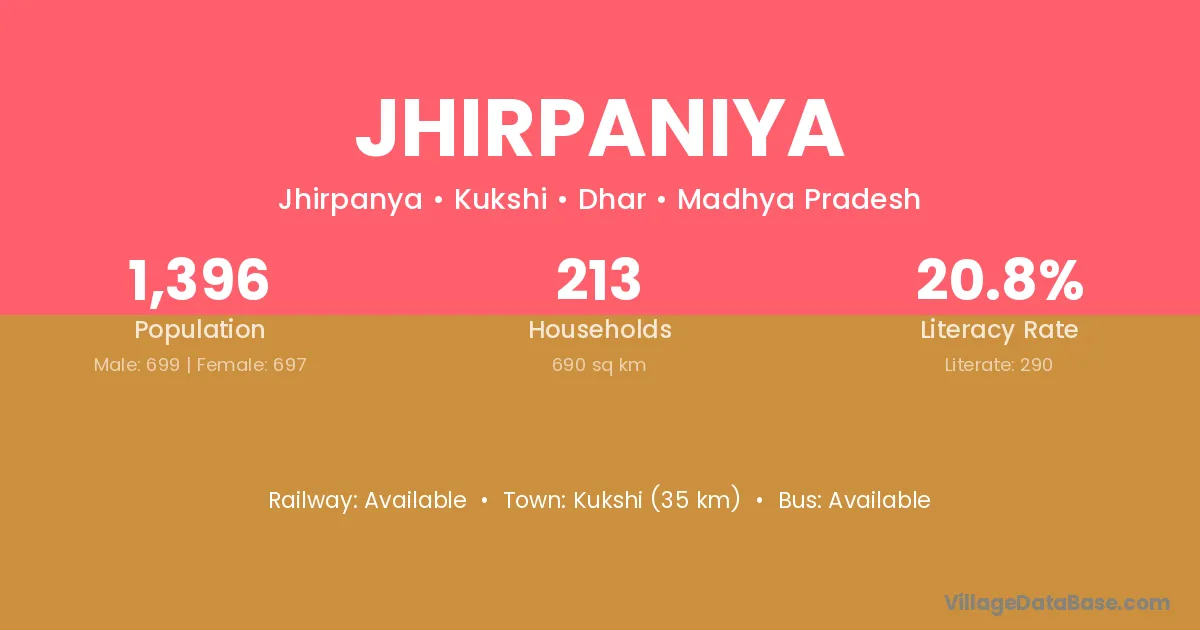 Kukshi (35 km) is the nearest town to Jhirpaniya village for major economic activities and is located approximately 35 km away.