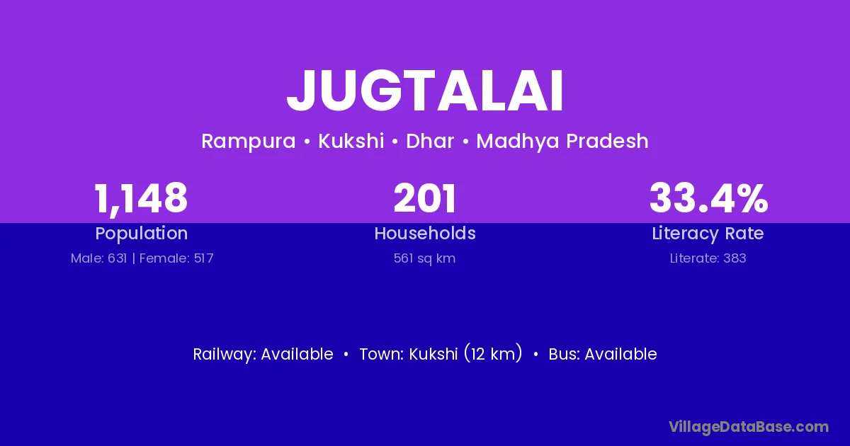Kukshi (12 km) is the nearest town to Jugtalai village for major economic activities and is located approximately 12 km away.