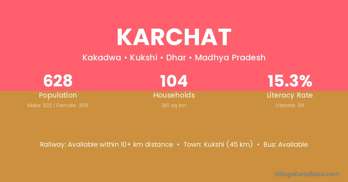 Kukshi (45 km) is the nearest town to Karchat village for major economic activities and is located approximately 45 km away.