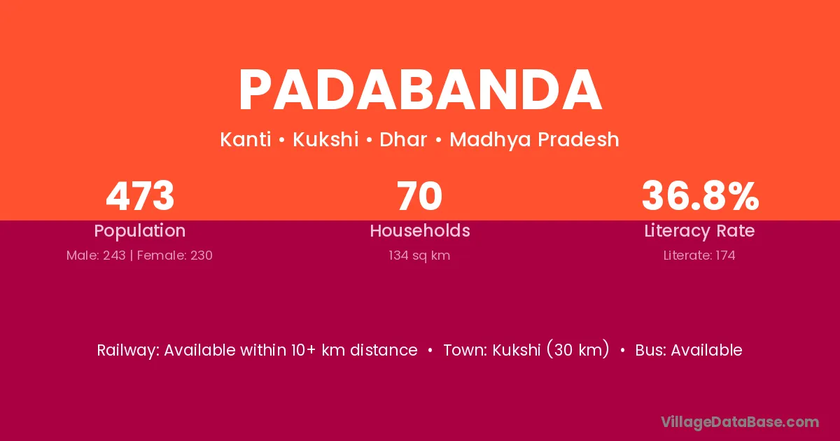 Kukshi (30 km) is the nearest town to Padabanda village for major economic activities and is located approximately 30 km away.