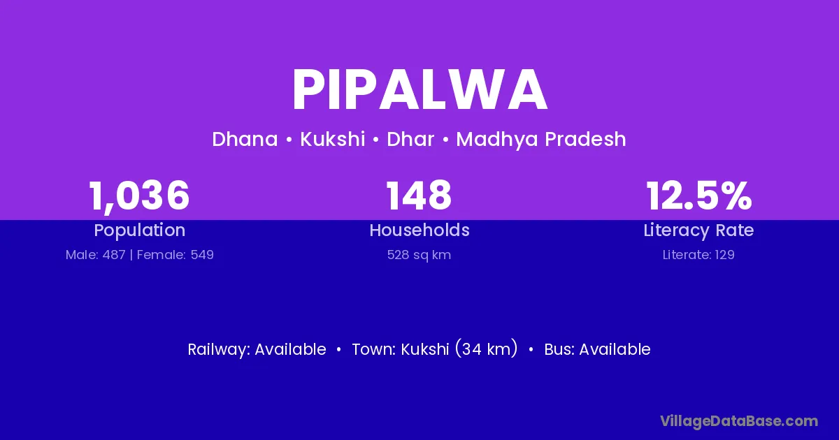 Kukshi (34 km) is the nearest town to Pipalwa village for major economic activities and is located approximately 34 km away.