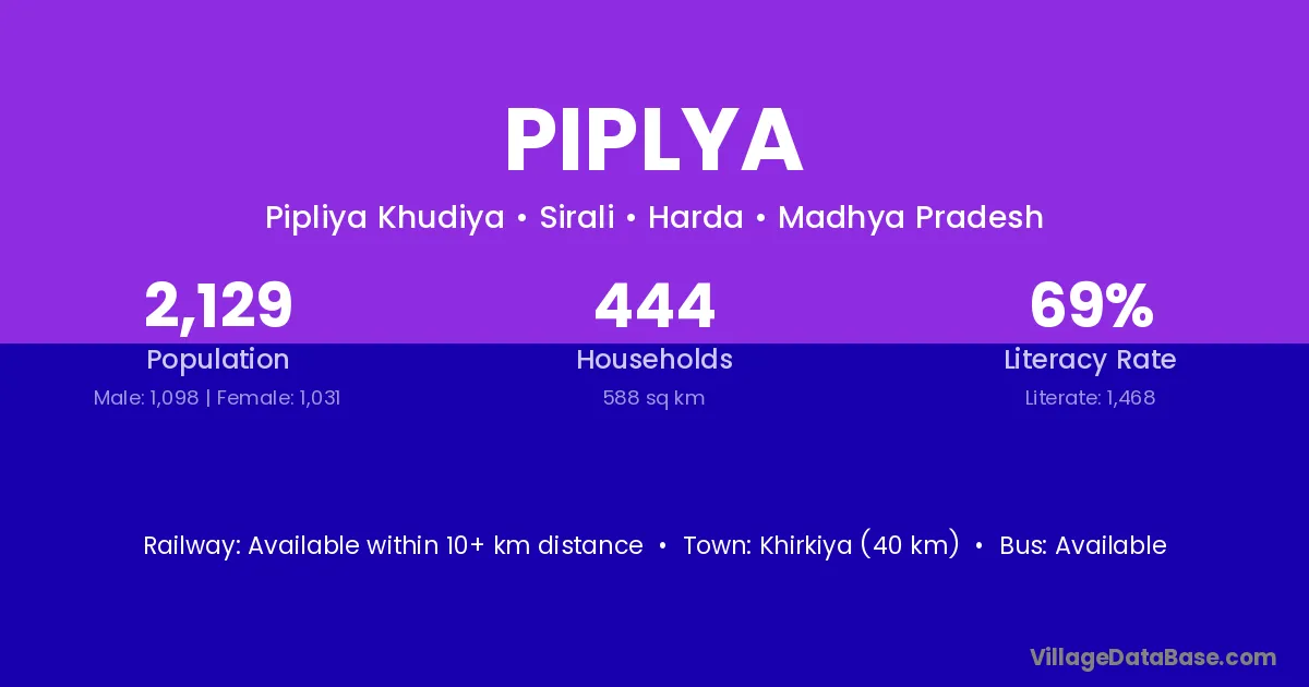 The literacy rate of Piplya village is 58.31%. Male literacy stands at 66.04% and female literacy at 50.33%.