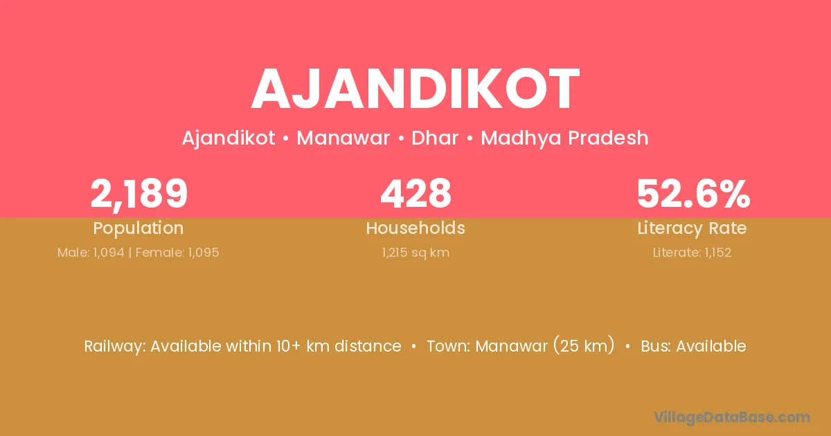 Manawar (25 km) is the nearest town to Ajandikot village for major economic activities and is located approximately 25 km away.