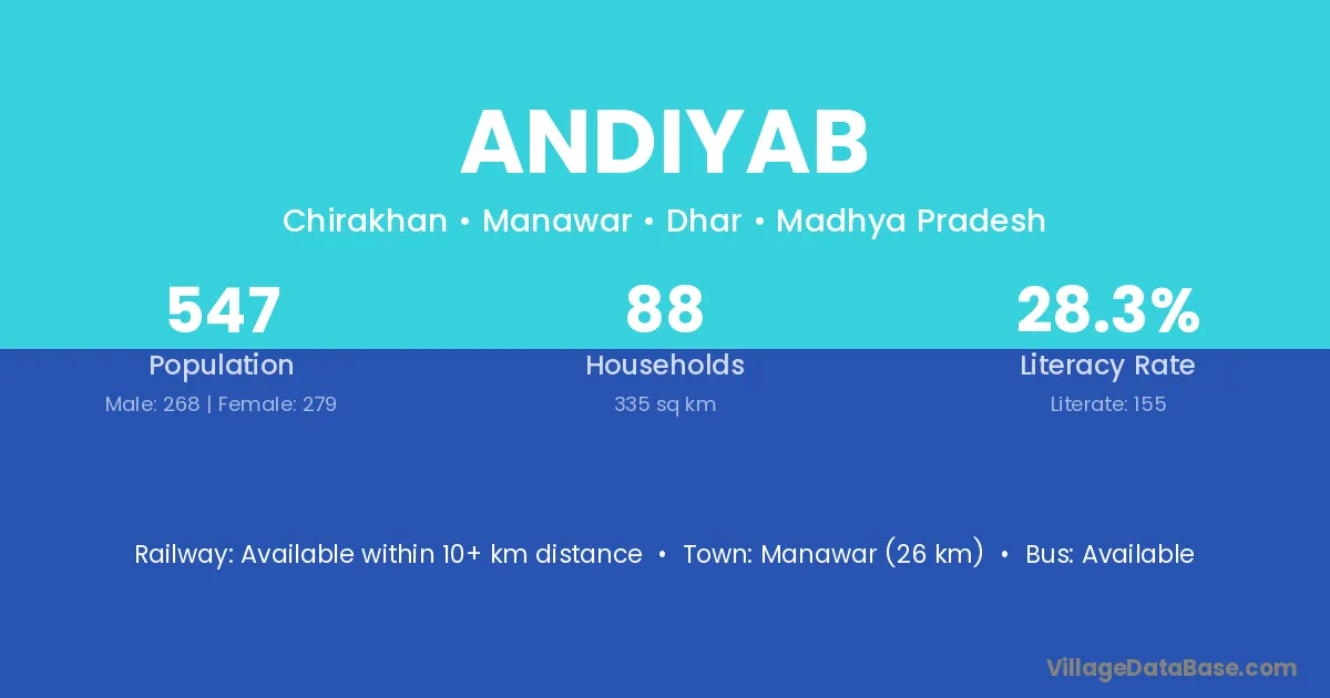 Manawar (26 km) is the nearest town to Andiyab village for major economic activities and is located approximately 26 km away.