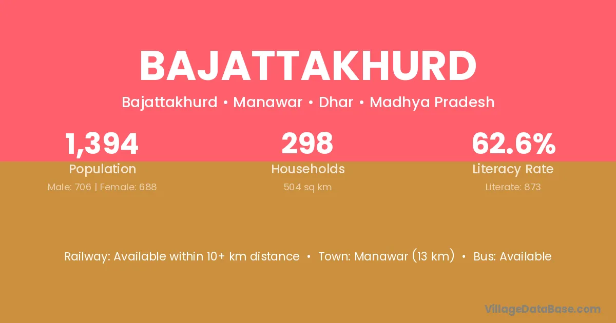 Manawar (13 km) is the nearest town to Bajattakhurd village for major economic activities and is located approximately 13 km away.
