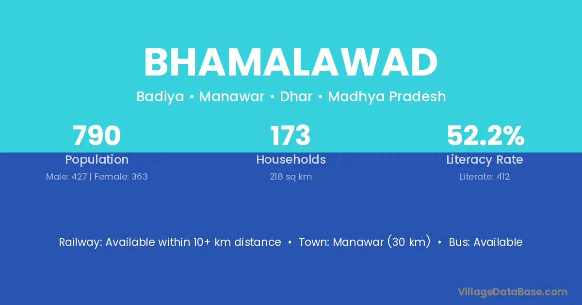Manawar (30 km) is the nearest town to Bhamalawad village for major economic activities and is located approximately 30 km away.