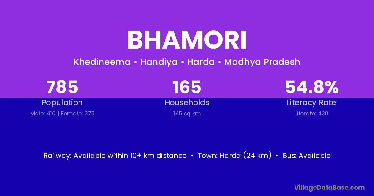 Manawar (21 km) is the nearest town to Bhamori village for major economic activities and is located approximately 21 km away.