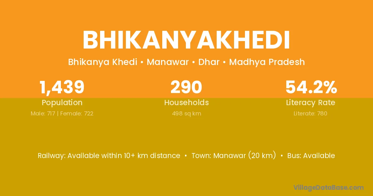 Manawar (20 km) is the nearest town to Bhikanyakhedi village for major economic activities and is located approximately 20 km away.