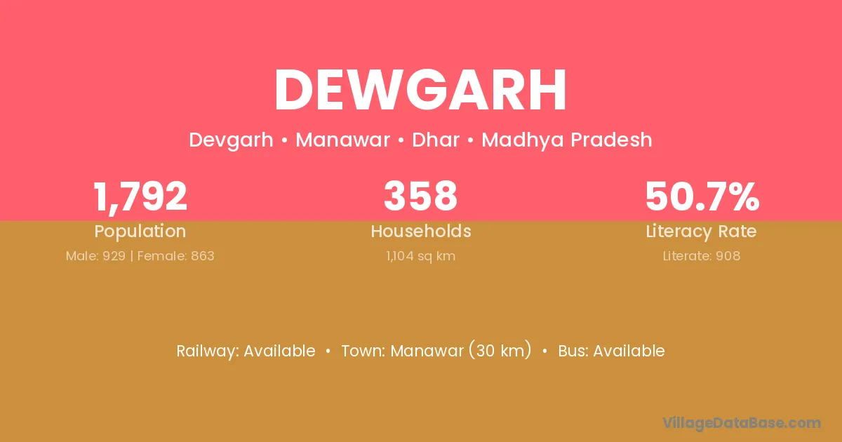 Manawar (30 km) is the nearest town to Dewgarh village for major economic activities and is located approximately 30 km away.