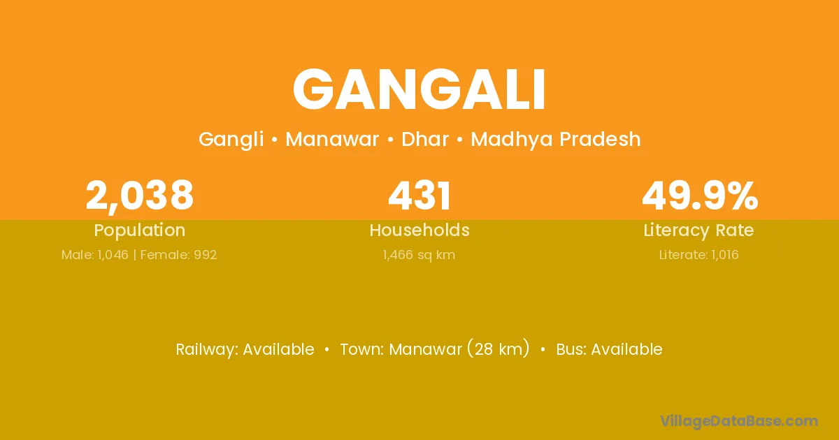 Manawar (28 km) is the nearest town to Gangali village for major economic activities and is located approximately 28 km away.